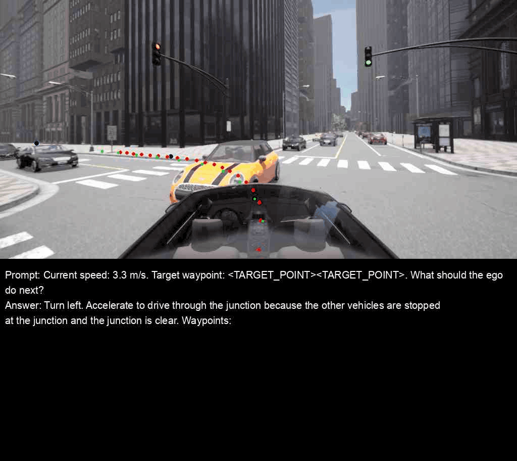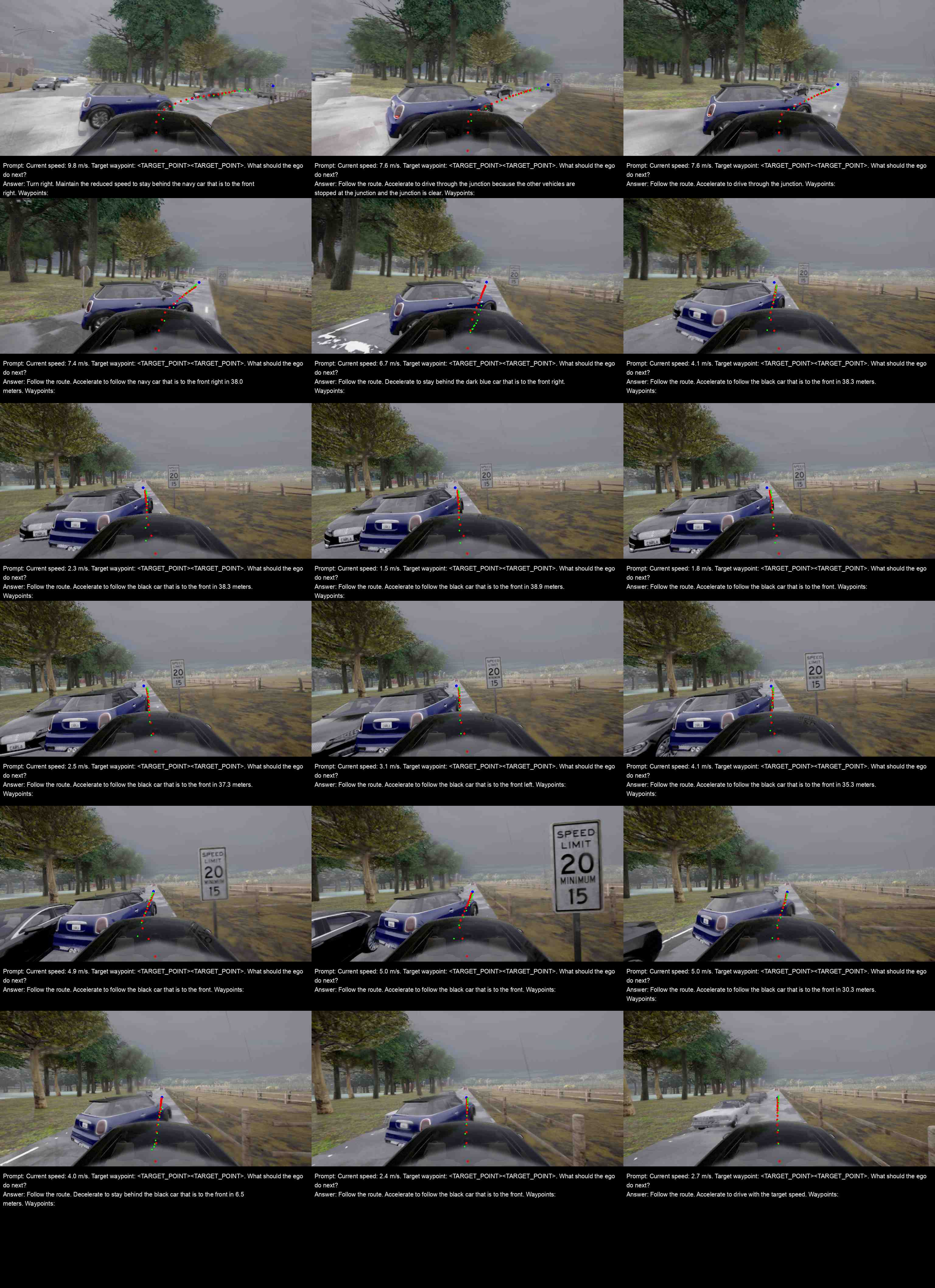 - 数据依赖严重:在 DriveLM 生成数据质量不高的场景(尤其是路口)中,模型表现极差,甚至会过拟合到错误的规则;